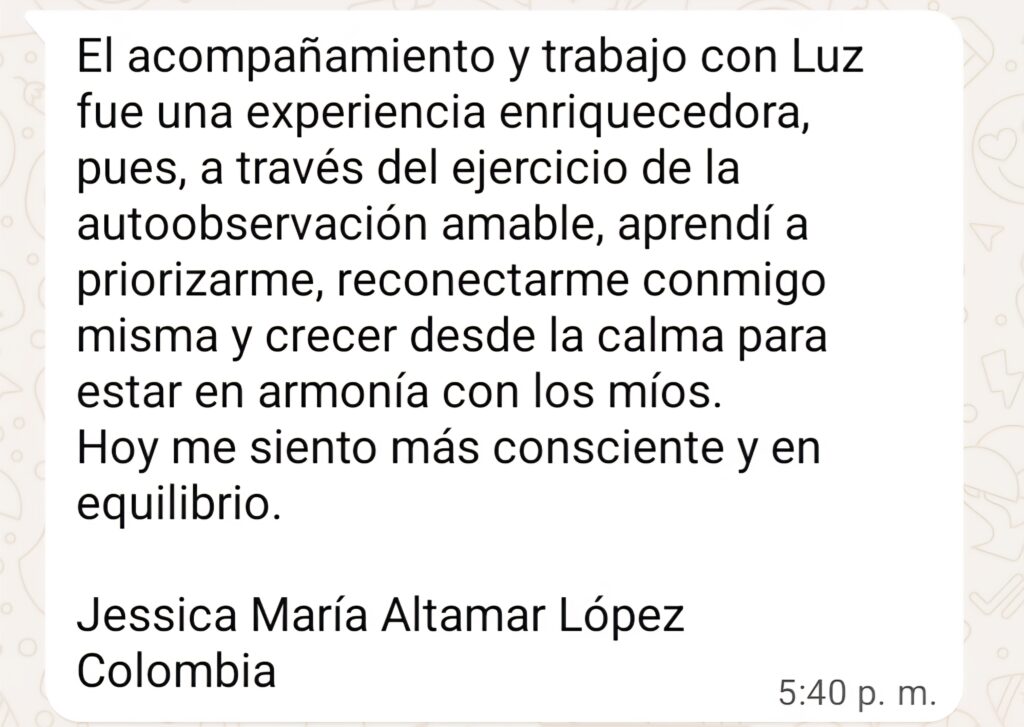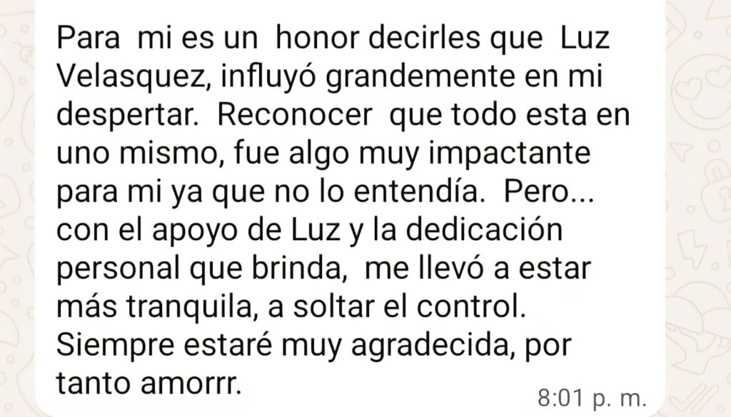 Mi Testimonio para Luz: es que lo más importante es como persona con mucha ansiedad, logré con respiraciones y acompañamientos encontrar dentro de mi la Paz. Me ayudó a conocerme y a llevar una vida en Conciencia, más tranquila. A estar en armonía, lo más importante es que yo misma puedo controlar las situaciones sin medicamentos. Estoy muy agradecida, espero que muchas personas puedan salir de esto con la ayuda de Luz.